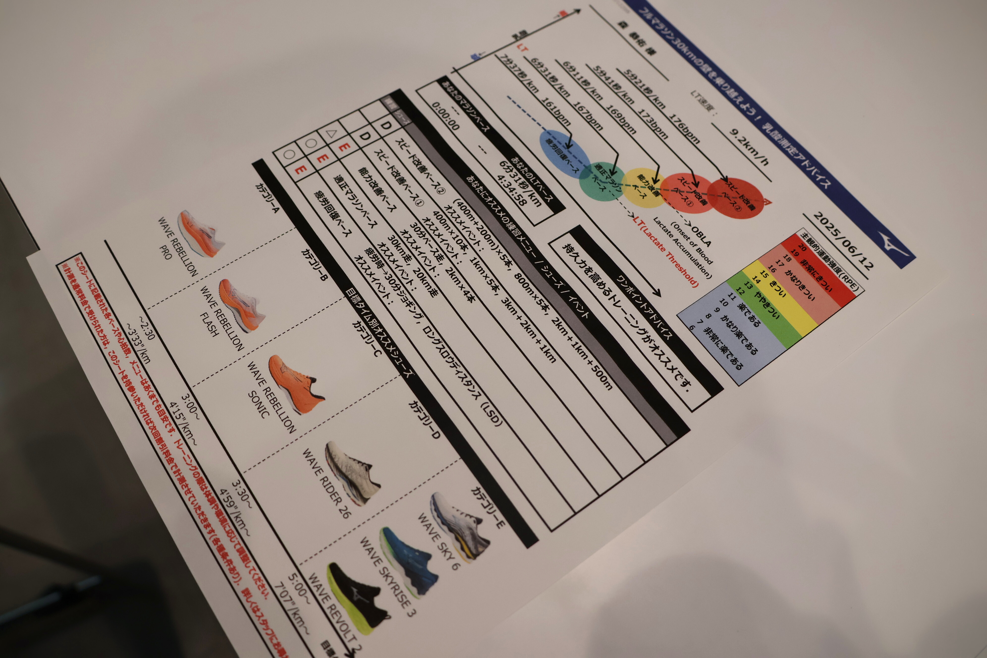 約30分の計測後、推奨トレーニングペースや完走予測タイムが書かれた計測結果シートが手渡された。今回の場合、LT速度は「9.2km/1時間」と判定され、そこから「まずは6分30秒/kmのペースで20km走を週1回。慣れてきたら、6分10秒でのインターバル走を」など、具体的なトレーニングメニューも提案された。
